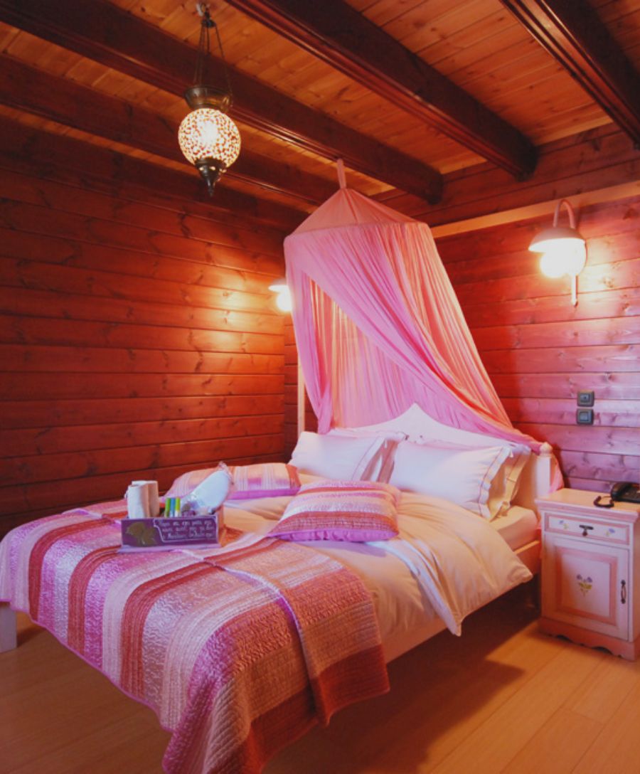 The chalet’s most beloved wooden room — soft, pink, and unforgettable.